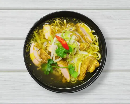 Clear chicken broth with noodles, sliced chicken, bean sprouts, spring onion, coriander and a red chilli garnish.