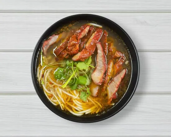 Rice noodles in clear broth with sliced grilled pork and coriander.