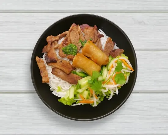 Rice vermicelli topped with lemongrass pork, golden spring rolls, cucumber, carrot and herbs.